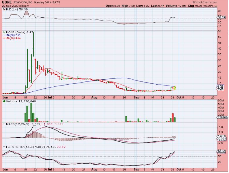 UONE is another example of the same kind of set up that CARV, KNDI, and several other companies are forming. I made very strong gains in many ‘flat base set ups’ that popped in April -June, and these may be setting up again.