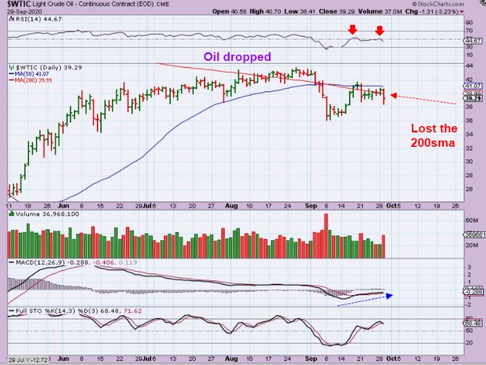 WTIC -Oil dropped away from the 50 sma and lost the 200 sma. Since WEDNESDAY is the release of the oil inventory report, we’ll see if Oil just sells off or not from here. Selling from here could get ugly over time. Oil daily cycles can be 50 days +, and this is only about day 15. That would mean that Oil could chop & drop for 7 more weeks if the September lows are taken out ( 35 trading days)? So…