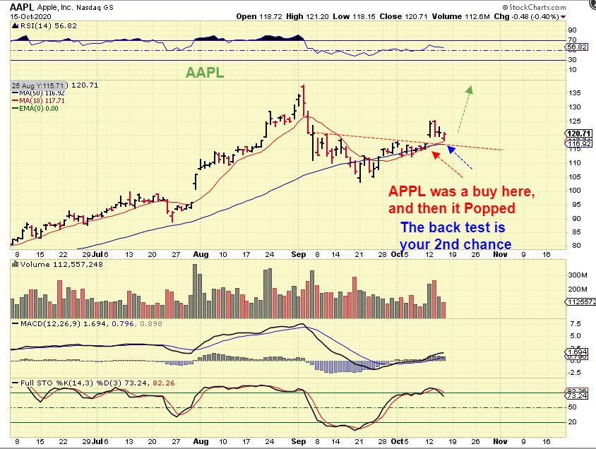 APPL did break out and has back tested. If you missed that first buy, this is a 2nd chance.  If you caught that buy and it Popped,  this is a good place to add.