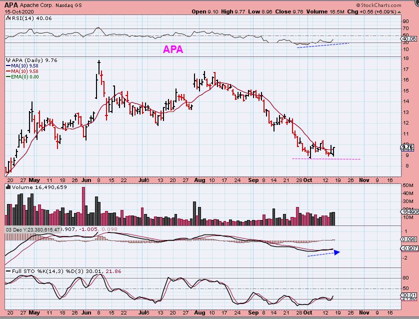 This double bottom with divergence in APA for example is an easy buy with a stop under recent lows.  That makes it Low risk/ High reward if you like this sector.   ERF, WTI, LPI, MRO, and others also reversed yesterday and are also looking more bullish.
