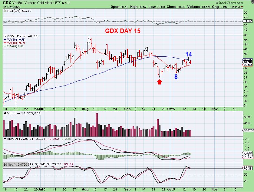 GDX – So far we have a peak on day 14 and GDX does seem too strong to be a final daily cycle. Some Miners like EGO are just blasting off higher like they are running straight up & out of an ICL, others are lingering behind.