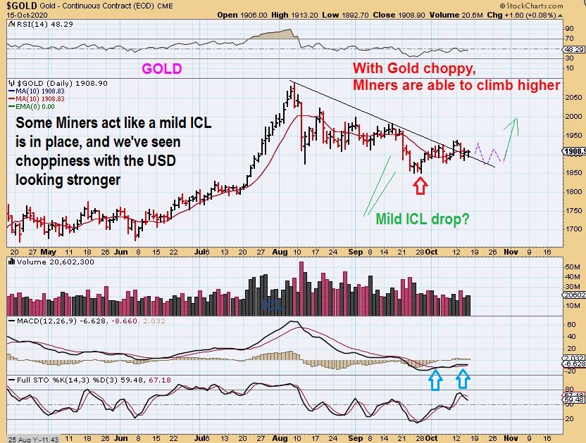 GOLD  #1 – Currently we are seeing Gold in another choppy daily cycle. As Gold chops sideways, we are seeing most Miners hold up, but we are also seeing some Miners break to new highs as Gold chops around. That is uncommon for a final daily cycle.  I also mentioned that a break of that downtrend can indicate that an ICL is in place.  So now that Gold ignored the USD POP, I can picture Gold possibly just being choppy with a strong dollar & an ICL could be in place.