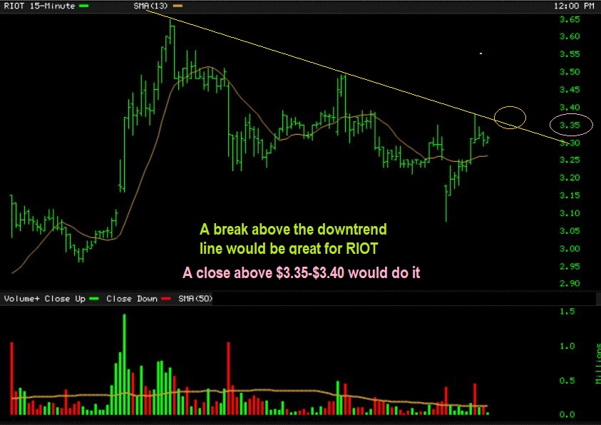 RIOT Intraday  – I also posted this chart to show the down trend line that Riot would break if it closed above the $3.35 area.  RIOT DID CLOSE AT $3.40