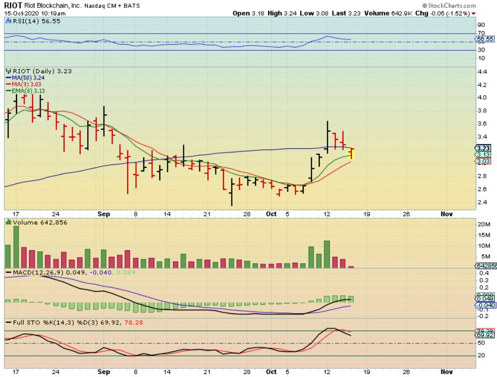 RIOT 10:19 a.m.   – Within the first hour of trading I posted this in the live area and mentioned that a close above this $3.24 area would be encouraging , placing Riot above the 50sma. Riot did actually close at $3.40