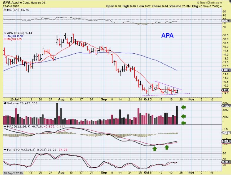 APA (from above in the report) : Still right at the lows, this makes them low risk if you buy with a tight stop. Many Oil stocks popped with volume and look Bullish. A pop to the 50sma is still a pretty good trade/ gain.