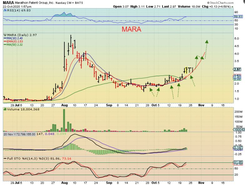 MARA – As pointed out yesterday, I do still feel that Bitcoin will continue higher and take MARA & RIOT along for the ride. There will be pull backs along the way, or possibly sideways chop & drop to the 10sma. I drew what that might look like here after yesterdays ‘stall’.
