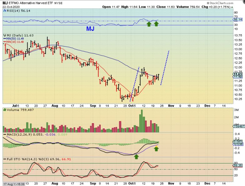 The MJ ETF – I used this weekly chart to show that MJ ETF was pushing on the 30 week ma and ready to break higher. Buy now or then. On the daily i was pushing the 50sma.