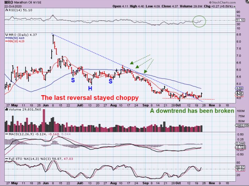 MRO popped to $4.37 and a longer term downtrend has been broken, so that looks bullish. I do want to note that at a prior low in July, we had a similar set up and it went higher but remained very choppy too, so there is a chance that Oil & Oil stocks remain a little frustrating with smaller gains and more sideways chop.