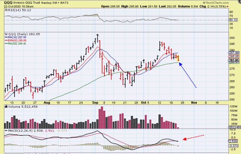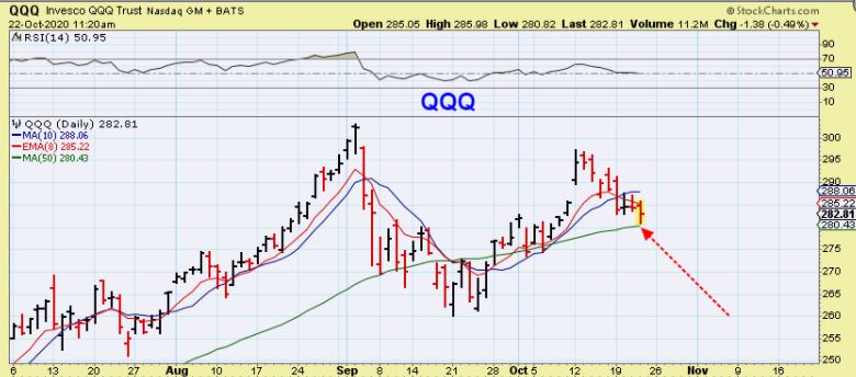 QQQ – I captured this chart 1 hour into the trading day & posted it in the live area ( under the daily reports). I have been saying that a drop to the 50sma is likely now, so a reversal there would be viewed as a low risk place to add to current positions or a buy.