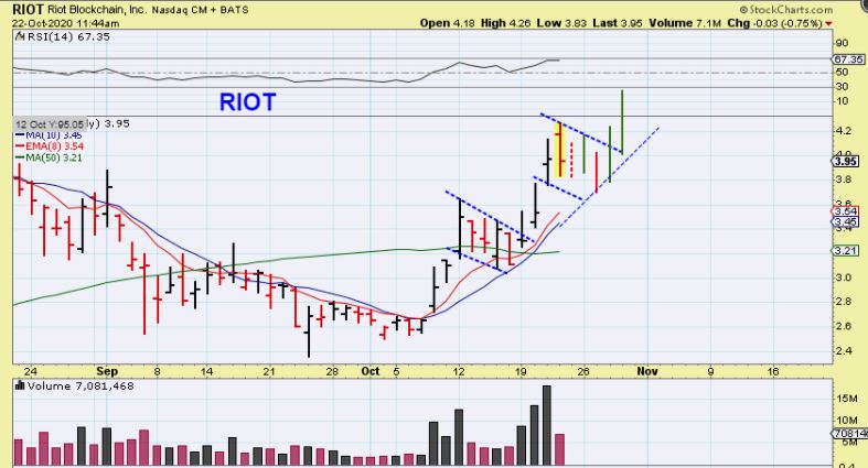RIOT dropped & chopped to the 10sma in a bull flag just last week, so I drew that as possibly happening again. I did this just in case it gets choppy, you will know what I am looking for. A bigger drop to back test the 50sma is not out of the question, but if Bitcoin pushes higher I doubt that we would see that now.