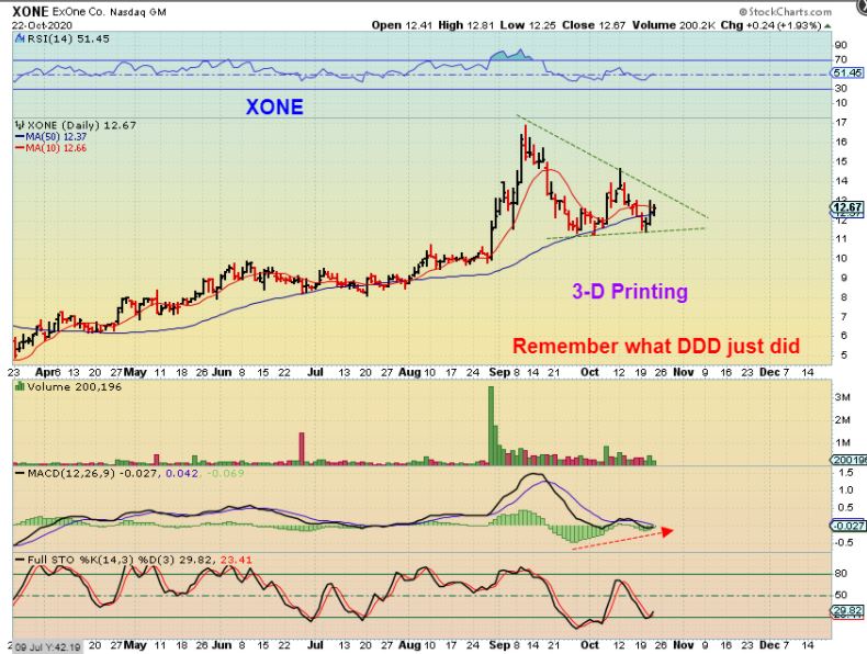 XONE – First take a look at 3-D Printer DDD. It has blasted higher recently. I see 3-D printer XONE as oversold, in an uptrend, and it just found support after a shake out at the 50sma. XONE seems to be building a bullish triangle after a rally from the July lows $8-$17 into September. That was a 100% run, and this is now a low risk buy.