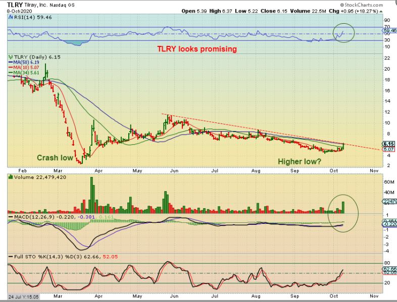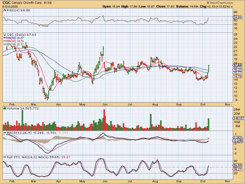I was posting in the live area that the MJ  stocks, which can move Very Quickly, were popping too. This is the ETF and it was also higher, now pushing on the 50sma which has bearishly curled lower.  I’ll be watching this sector, but look up charts of  CRON, CGC, TLRY, VFF, APHA, ACB, etc etc They all had a bullish POP at the same time. I will post 2 of those charts below.