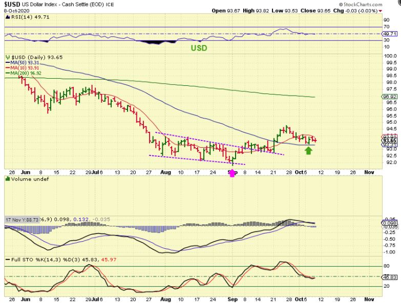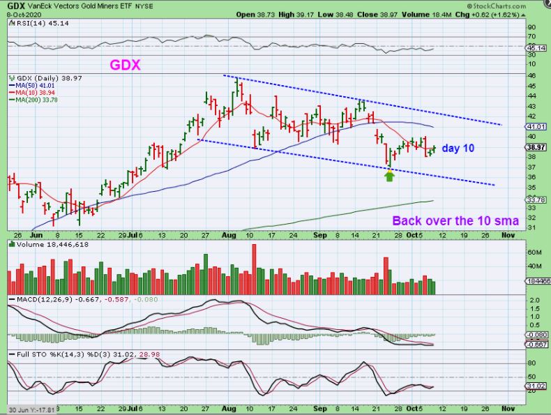 To be honest, GDX on day 10 does not look as bullish as Gold or Silver, but it is a higher low on day 8 and THINGS CAN CHANGE.  The drop that GDX & GDXJ took Tuesday looked ugly and very weak. Now on day 10 GDX tried to close above the 10sma.   Lets see what Friday brings for the Miners.  WHAT IF GOLD DECIDES TO JUST BREAK HIGHER AND WE HAVE TO CALL THIS A STEALTH  ICL IN GOLD?