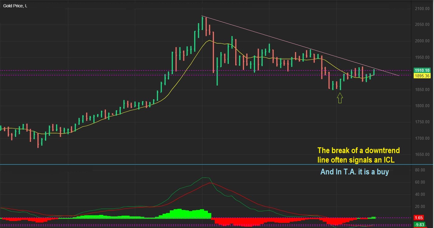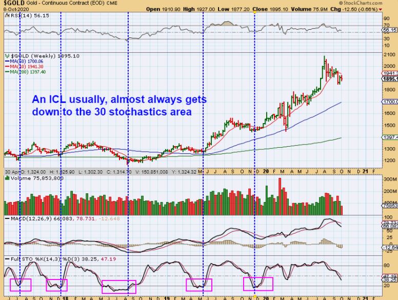GOLD ICL – Even with a mild ICL,  Gold will usually (and I mean almost Always ) get that stochastics down into oversold territory by tagging the 30 area on a weekly chart.  I would say that we are 2+ weeks away from that.   Well, the last CRASH In March didn’t get us there, and we are in the area that the crash put us in at the last ICL- so I am paying attention going forward.