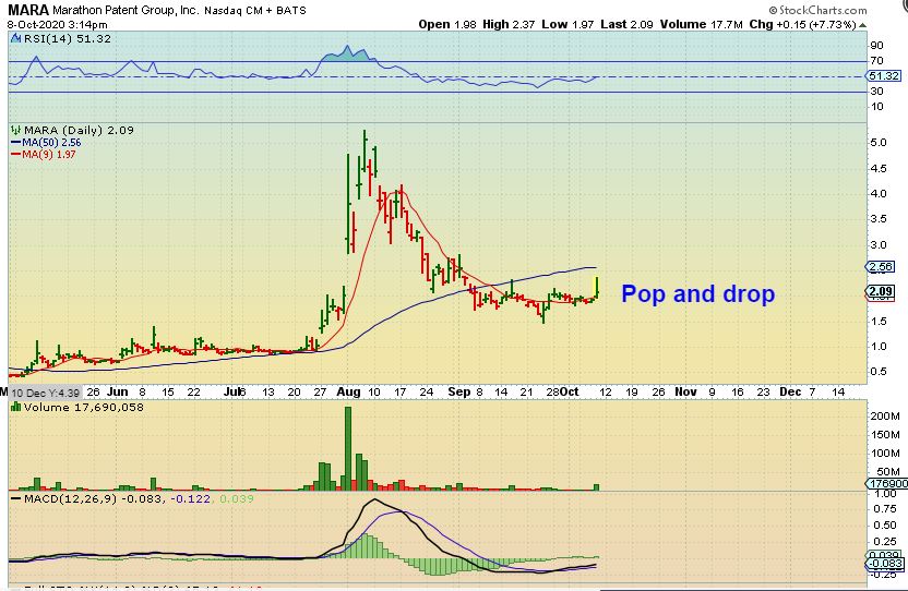 RIOT popped and only sold 1/2 way off but I still decided to get a starter position. Now I just look for some follow through. I bought the last POP over the 50sma near Sept 16 & got stopped out when it lost the 50sma, so that was dissapointing, but this looks good and does have nice volume.   Also I sold some of my recent trades like my SPWR 2 days ago for excellent gains and sold all my other solars to lock in gains yesterday too, as they all started to pull back.  I sold WWR & OPTT for big gains, so I have cash to deploy that is all profit in a few starter positions without considering it a huge risk. With those gains adding a small starter position here is not something that I have to worry about too much if it just wiggles around, but I will still have stops in place because these can drop or pop swiftly.  Both MARA & RIOT had a nice pop in volume.