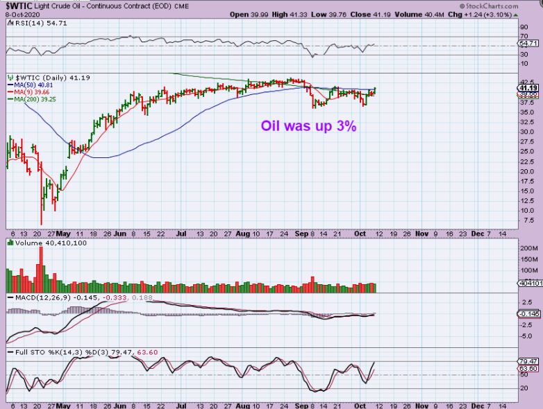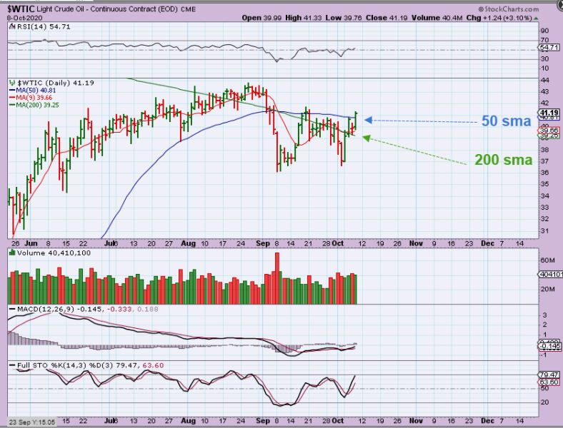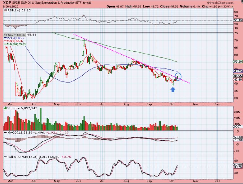 You can see that it has not only closed above the 200 sma, but also closed above the 50 sma. If Oil continues higher, this is a bullish set up.  What about the Oil stocks that we have been discussing?