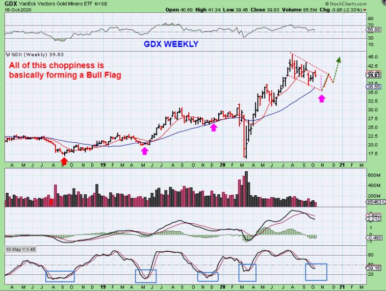 GDX WEEKLY #1 – Let’s just start by saying that this recent choppiness gave us a weekly Bull Flag. I can picture one more quick drop not only as not damaging the chart, but also as completing the Bull Flag to support. Now look at the stochastics and you see that another drop would help it reach normal oversold conditions too. WE COULD GET 1 MORE DROP.