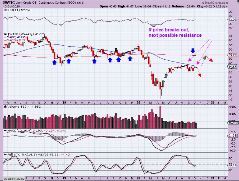 Look at the Weekly chart of Oil here. After a run out of the ICL we have had choppy sideways trading after we reached resistance. 3 possible paths would cone from this.