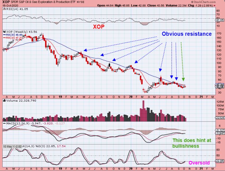 XOP WEEKLY – The Oil stocks are starting to look bullish on the daily charts, as pointed out in Fridays report. The weekly chart still has the XOP pinned under overhead resistance. A break out would be quite bullish, I will continue to monitor this sector in the daily charts.