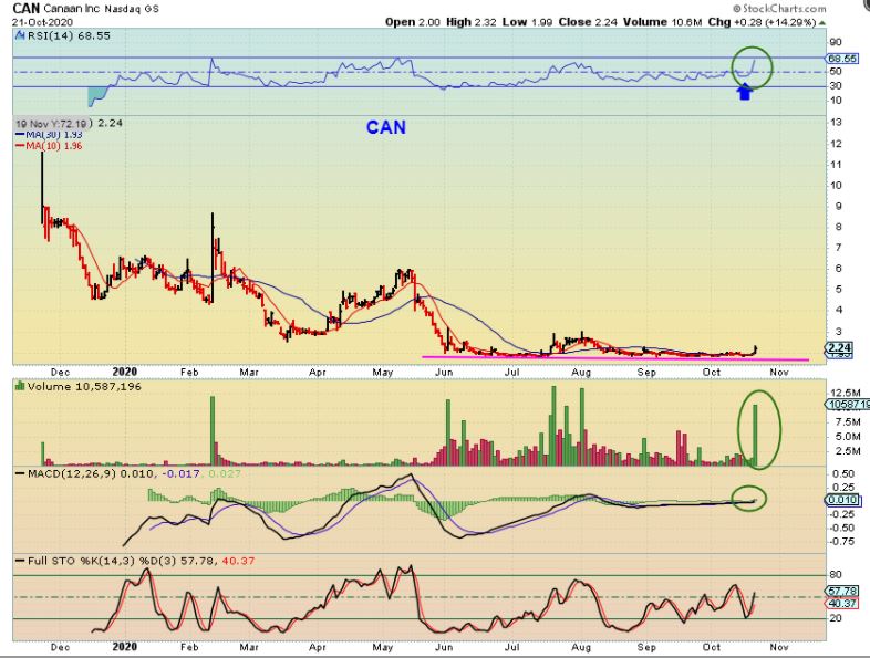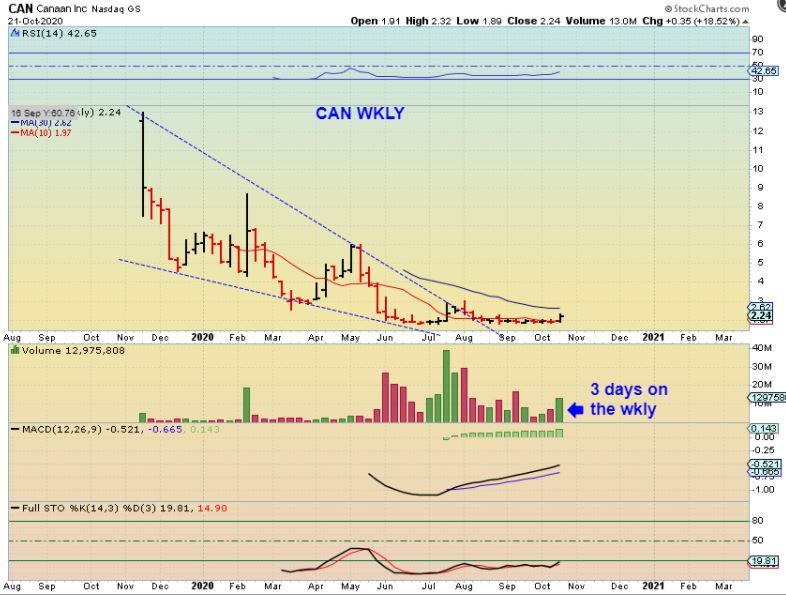 CAN DAILY – This is another company on the blockchain list, but it wasn’t responding to Bitcoins rise until yesterday  ( Thx SOG for mentioning it). I jumped in as it started to leave this long base. It closed up 14%, so it may seem hard to buy, but I’m showing it because…