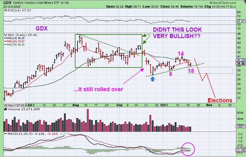 2. Since GDX only has a small pop & drop yesterday with the USD dropping & Gold popping yesterday, this still may be a weaker final daily cycle.  If it is, it may drop to an ICL as we close in on the US Elections/ FOMC mtg (Red Arrow).  I would guess that the 200sma could come into play around the time of the US elections.