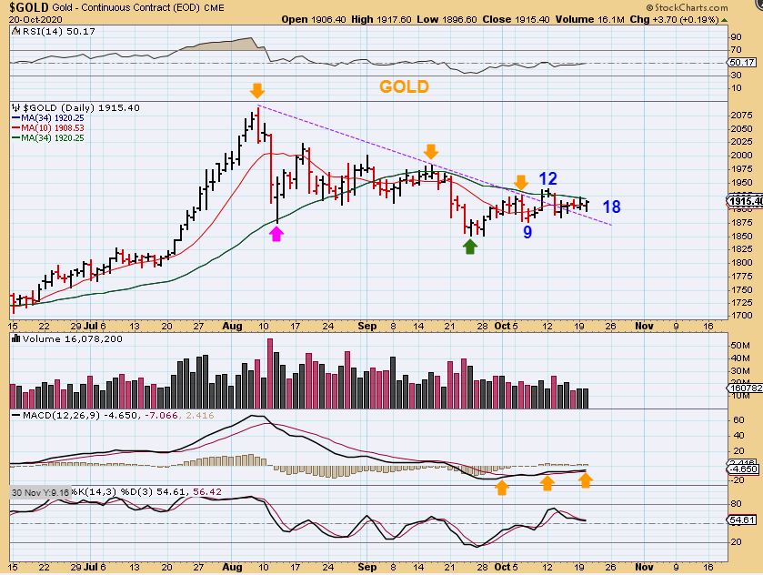 SILVER #3 – I would have expected a drop to the 200sma as an ICL (and we still could), but so far this resembles an ICL with the last drop. IF IT WAS AN ICL, we might see a run up to the upper line as drawn here, and then a drop to the dcl  near elections might put price right back to where we are now. This would become the major buy opportunity that likely precedes a strong rally out of this consolidation.