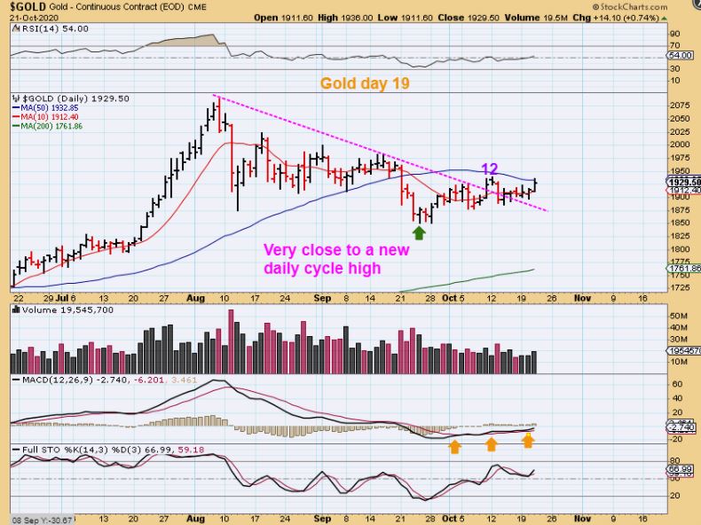 GOLD AT THE CLOSE – Gold did NOT break those highs, but it was close. The 50sma acted as resistance, even though the USD rolled over.  SO far all we can say is that this has been a choppy sideways daily cycle in Gold.  The good news is that if this is a 1st daily cycle ( ICL in place), it is just choppy and sideways. Those are often followed by a strong blast off during the 2nd daily cycle and we would catch that run higher.