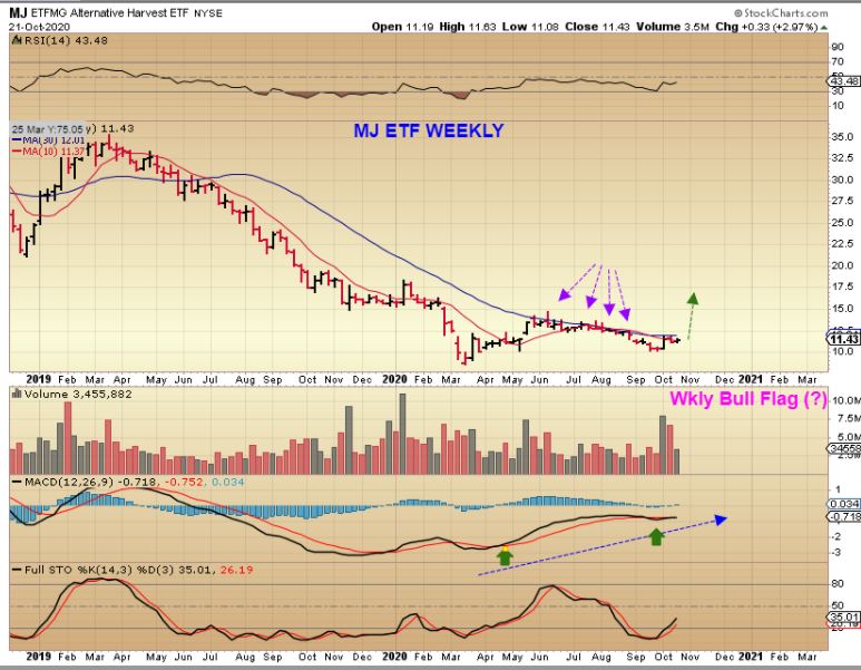 MJ ETF WEEKLY – As mentioned, many Medical Marijuana Companies are starting to set up bullishly, and the ETF reflects that. This looks like it is oversold and ready to break out above resistance. With  this double bottom, the MACD has been strong.