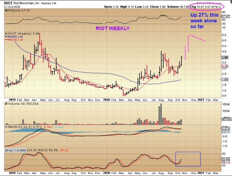 RIOT WEEKLY – The RIOT, MARA, BITCOIN trade has been playing out very nicely. Yesterday CAN, NXTD, FTFT  and a few others joined the race. I do expect more upside seem on the Bitcoin charts above, but there are no guarantees in trading, right?  So sell some on the way up to lock in gains if you wish, or raise a stop and hope that we don’t get a large gap down one day. These do move swiftly in both directions.