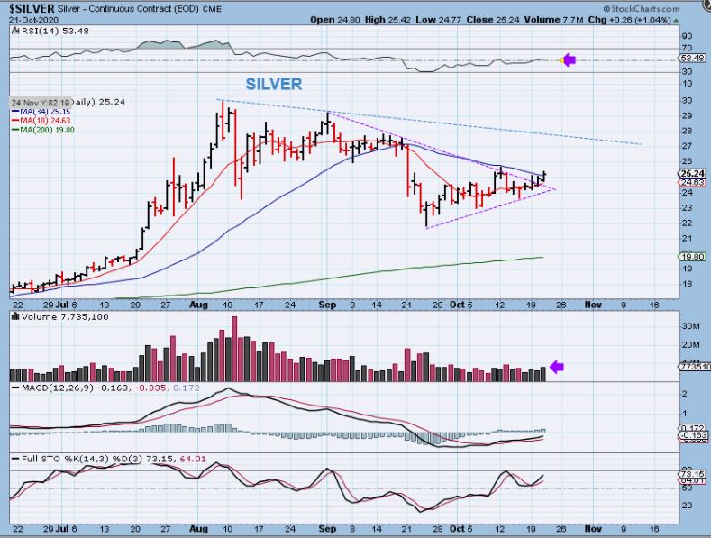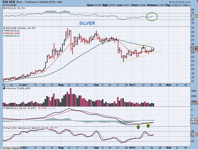 SILVER #1 – Silver did break above the 34 sma, but not above that day 12 high.  Volume did increase slightly.