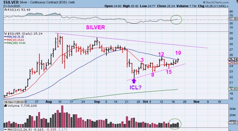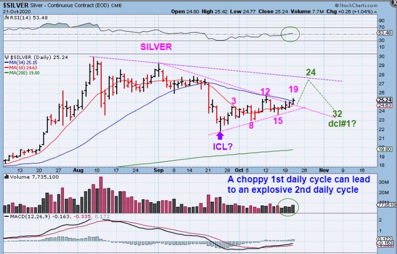 YESTERDAY I WROTE ABOUT SILVER – This looks bullish too, but it also could go either way. The problem is the sideways chop and lack of strong volume on the up days ( so far). A break above the 34sma and a new 1 monthly high would make it seem as though an ICL drop happened in September and this could be the first daily cycle as mentioned in prior reports.