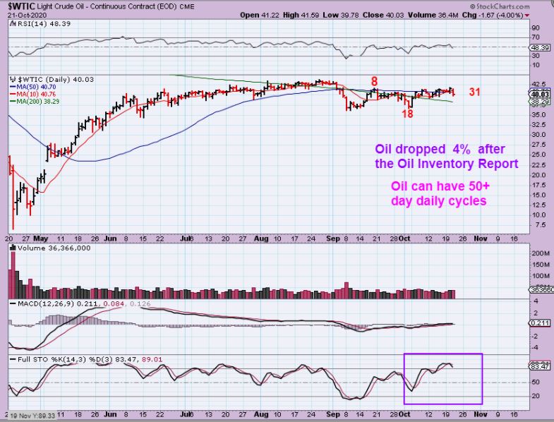 WTIC Day 31 – Oil dropped 4% after the Oil Inventory release, so basically I would say that this tells me that the chop continues  now with more of a downside bias the older this daily cycle gets. please read the chart.