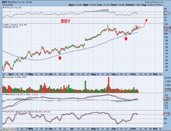 This was BBY on September 22 when I was recommending a lot of these good companies that pulled back & reversed at the 50 sma. I’ve mentioned that I would expect these to form ‘cups’ and then we watch for a possible break to new highs.
