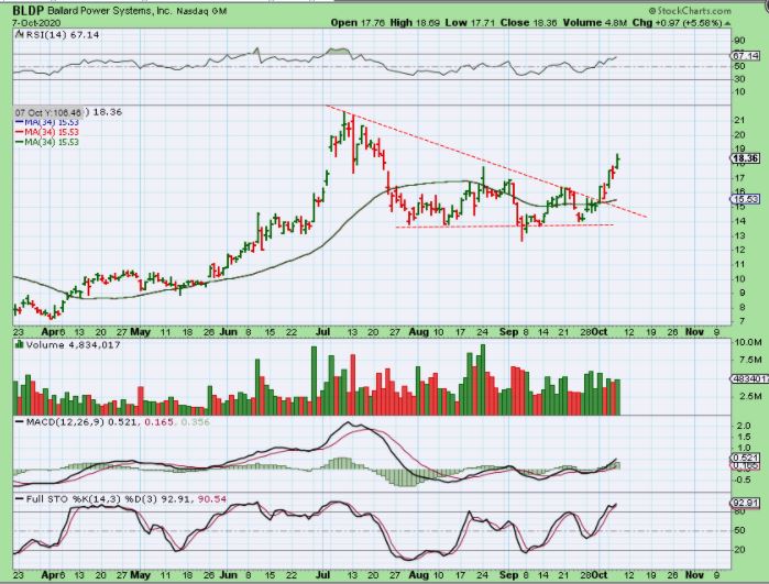 PLUG ran from that reversal in August from $7 to $14 and then choppily consolidated the gains again through September. Now PLUG broke out & ran again from $11 to $18+. We see choppy consolidations, but THE SECTOR IS ON FIRE. Now we’ll look at BLDP again…