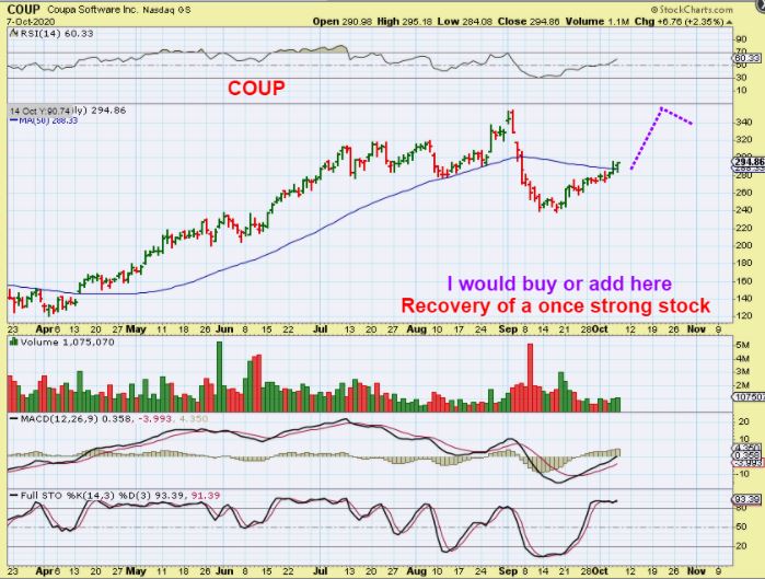 COUP TODAY – This is a good place to add to your reversal buy. If you didn’t trust this trade at the lows, you could even start a new trade here at the 50 sma, since it is proving itself & recovering.