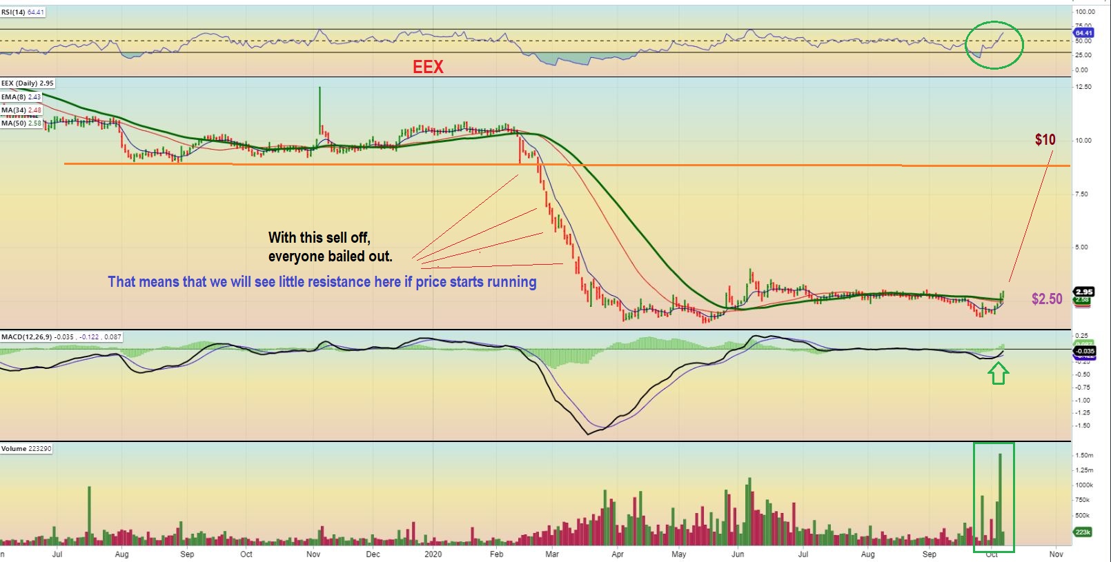 – When this sold off from the $10 consolidation, it was that Feb-March Crash that the General markets experienced. For EEX though, it was constant selling day after day. That tells me that people were just bailing out causing that free-fall.