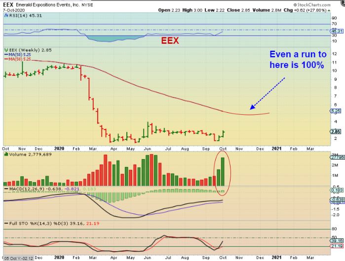 EEX WEEKLY – I love this weekly chart too. We see a huge flush out in February -March and then a base formed. That volume this weeks represents only 3 days of trading as it tries to get above this base. Even if this only ran to the Moving average that stopped it in February that would be 100%+ for gains, but I think that it can break through it.