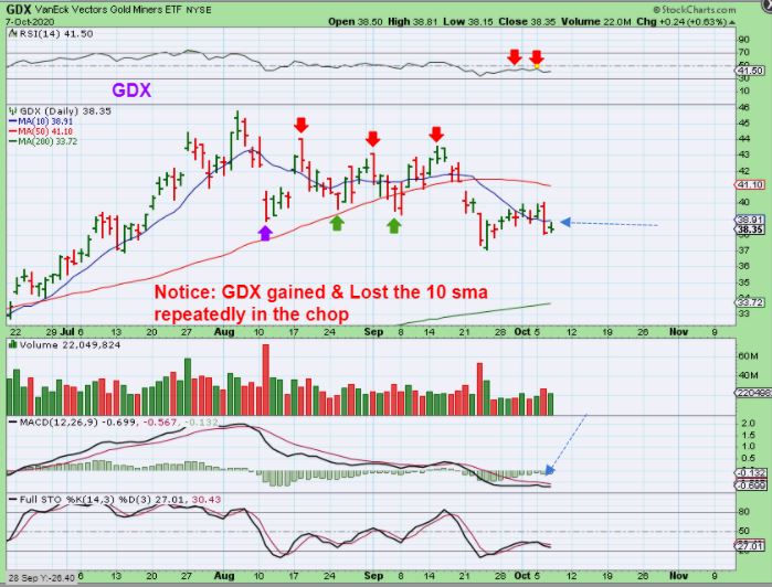 GDX SAME CHART: I do want to point out something to keep in mind. IF GDX does recover that 10sma, that is not automatically a Bullish recovery. Notice that in the last daily cycle, recovering the 10 sma happened 3 times and it just remained choppy, sloppy, and weak. Regaining the 50 sma might change my mind though.
