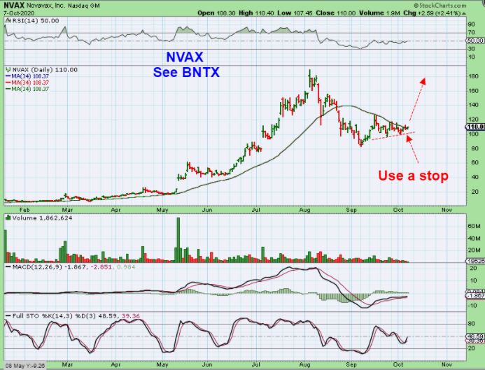 NVAX -This crawl under the 34 sma looks very much like BNTX, so you can buy it with a stop or buy i after it breaks out higher.