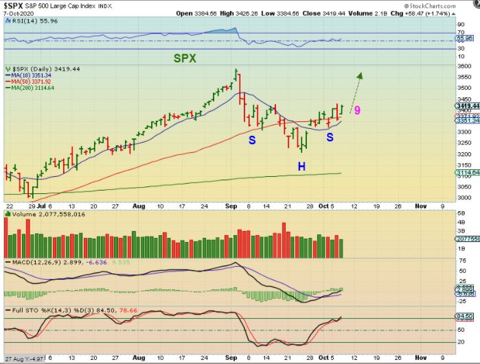SPX – On day 9 the General Markets rallied back from that Random Trump Tweet. I mentioned yesterday that I did think that we were seeing just a possible knee jerk reaction ( over reaction sell off ), since his tweet exclaimed a delay in stimulus for 1 month and not that it was completely eliminated. The main point was that price held above support & this now looks like an inverse H&S.