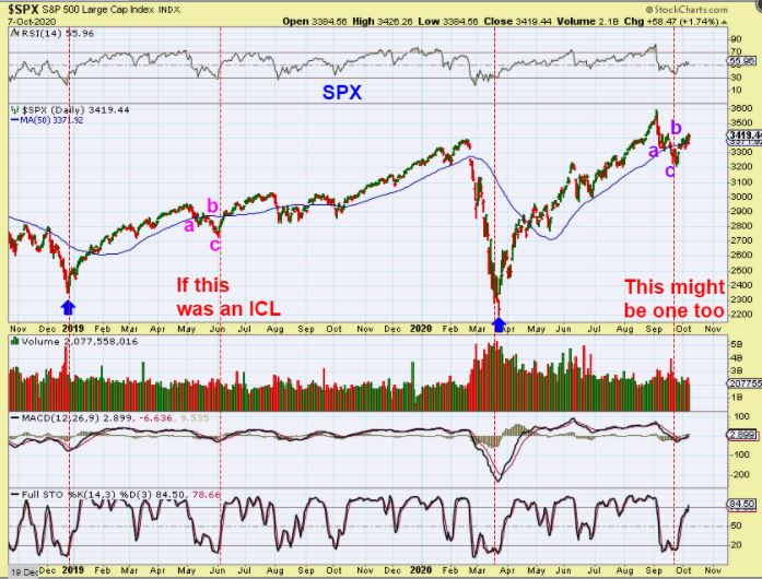 THE SPX fell below the 50 sma after the crash in 2019 in an a-b-c drop. It then rallied (sometimes choppily) for the next 8 months, so that was the ICL at 5+ months. We may actually have an ICL in place here at 5+ months. So what I also did was looked at something else…