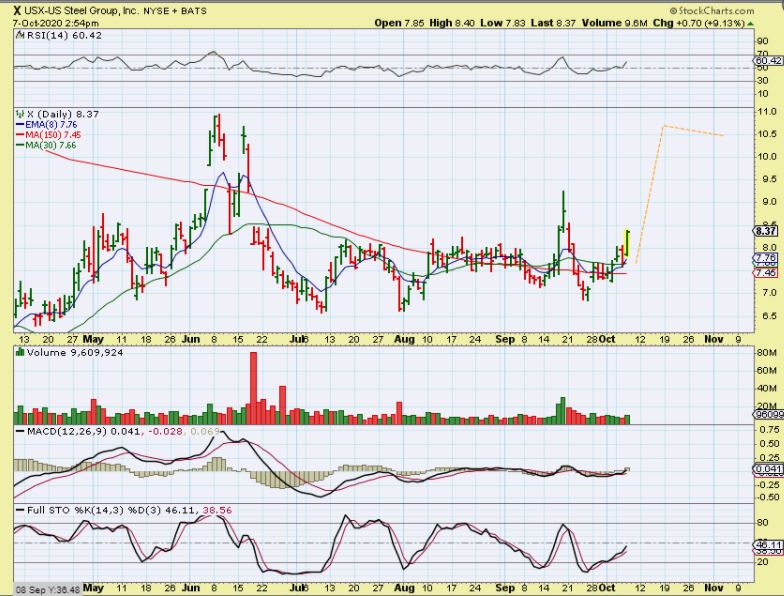X – dipped when the markets sold down Tuesday, but popped 10% yesterday so it remains on track. One of our readers wrote and reminded me of the US Steel ‘buy’ saying that he added yesterday- Thanks!