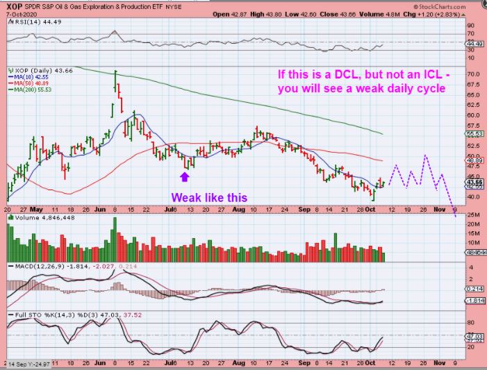 XOP – Oil stocks actually moved higher and this could be a dcl, but was THIS an ICL with the General Markets? Are these following the General Market more than Oil? At this point, I can’t tell. I drew a weaker daily cycle here. Like I said, this reversal low COULD be bought, but it may or may not really make good gains if it isn’t an ICL…