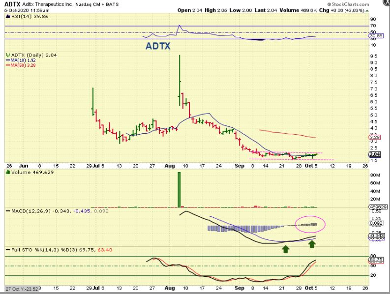 ADTX:  This has been forming a nice base.  I actually had this on my watch list and I liked the intra-day charts set up yesterday, so I started a position .  I may be early, but you can add this ticker to your watch list if you are interested in seeing whether it gets follow through or not.