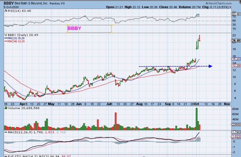 BBBY – Retail has done very well, especially if they offer online shopping like AMXZN, BBBY, AMZN, etc.  This break out was a buy set up when it reversed off of the 50 sma at $11  ( purple arrow) and   it was also a Buy as it broke out at $13.