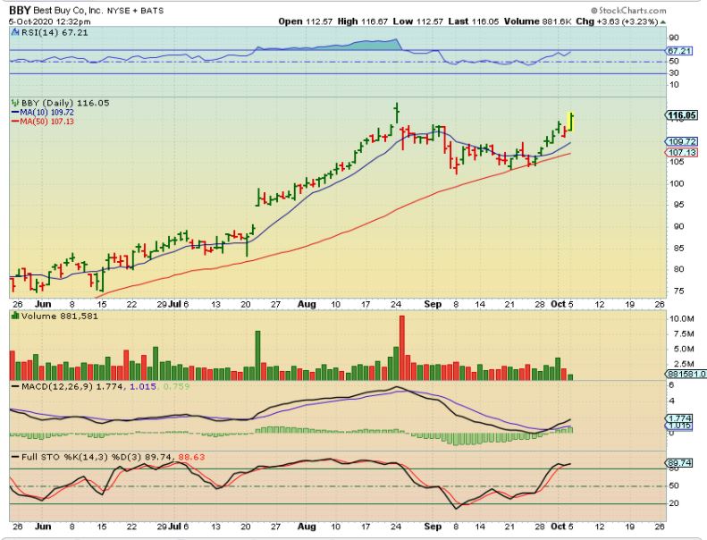 BBY is forming that cup. Usually  this forms a cup and handle, or it just breaks out & runs, so I would continue to hold it. So the retail stocks are doing well.