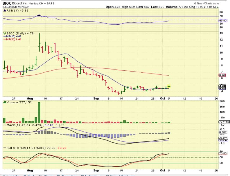 This is a chart of BIOC showing the potential. They did a reverse split so now a run to former highs would move from this $4 area to $12.  I am NIT saying that this will happen, I started a position because I liked the volume at the time, but it didnt follow through higher yet.  If I am early and this dosn’t start moving, I will sell & put it back on the watch list.