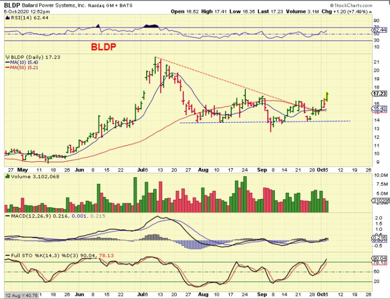 BLDP  is an Energy Stocks that has done very well in the past.  I bought it in September and when it didn’t run toward the prior highs as expected, I sold it.  AT THIS TIME it does look ready to run higher.  BLDP  broke a down trend, the 50 sma, and has other bullish features.