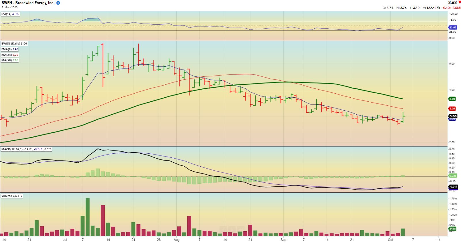 BWEN – This is a close up and it shows that BWEN does have resistance with the 50 sma above it, but it can get through that over time.