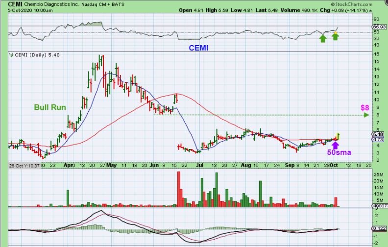 I mentioned that I bought CEMI last Friday  when they got an FDA approval and it popped 4% with good volume. Yesterday it popped another 14.77% and I’m holding to see if it will at least fill that overhead gap.